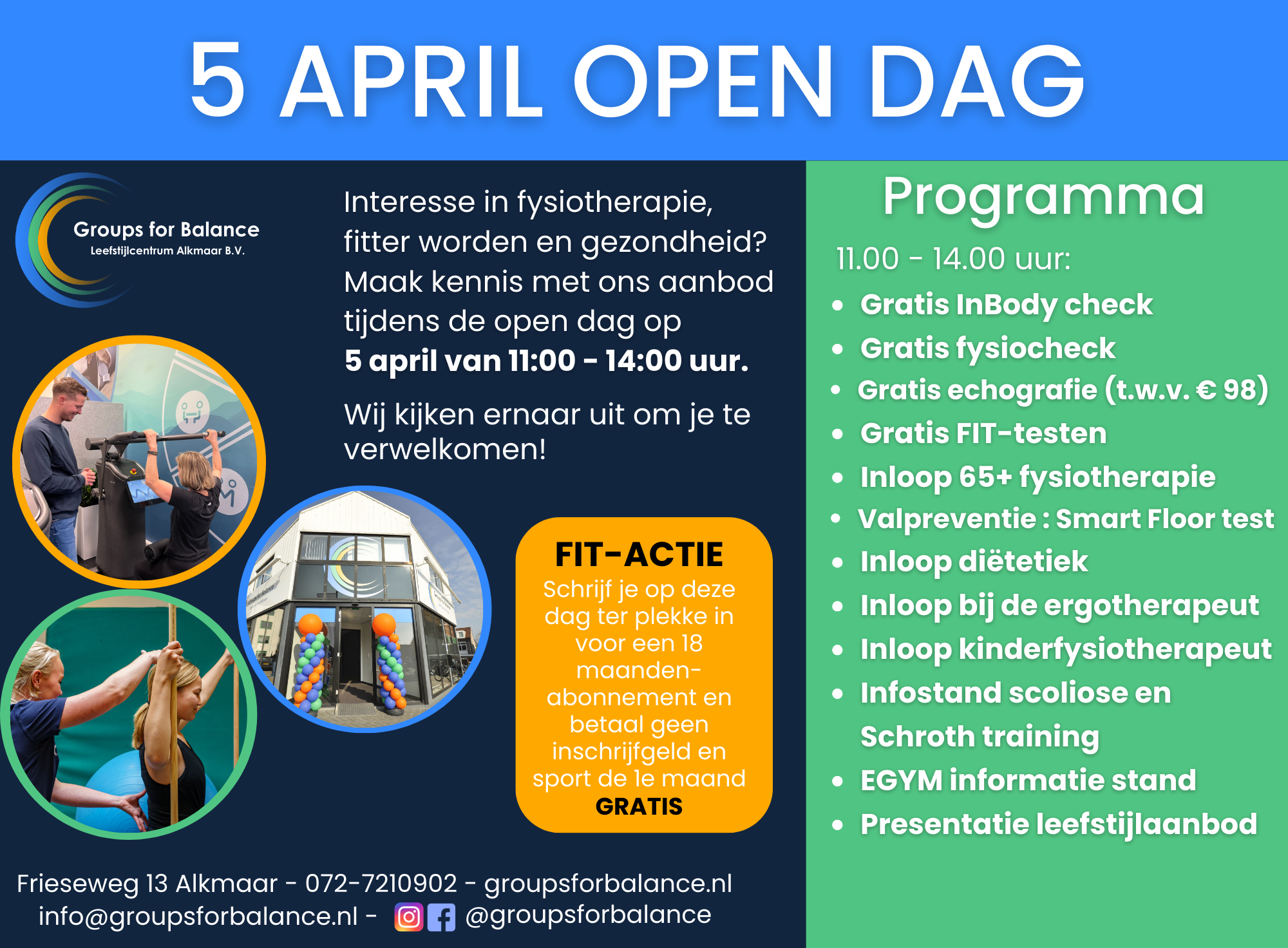 Op zaterdag 5 april opent Groups for Balance – Leefstijlcentrum Alkmaar haar deuren voor iedereen die geïnteresseerd is in gezondheid, fysiotherapie en een actieve leefstijl. Tussen 11:00 en 14:00 uur ben je van harte welkom op de Frieseweg 13 om op een toegankelijke manier kennis te maken met ons veelzijdige aanbod.